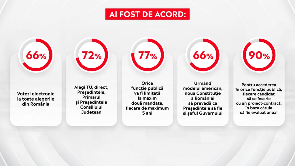 La întrebarea “Ești de acord ca toți judecătorii CCR să fie aleși de tine pentru maximum două mandate de câte cinci ani, pe baza unui proiect de candidat?”, din cele 30.000 de voturi exprimate, 86% sunt pentru, iar 14% împotrivă.