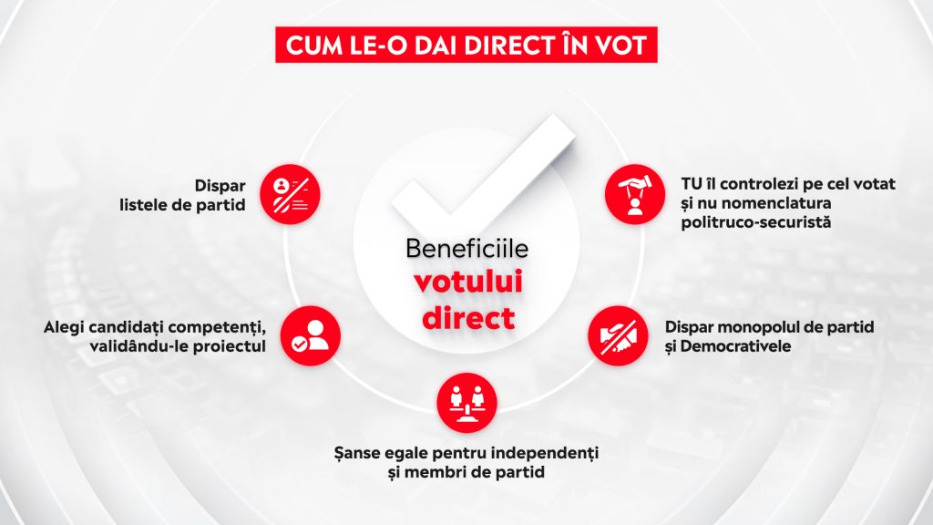 “Dispar listele de partid. Alegi candidați competenți, validându-le proiectul. S-a terminat la votul direct cu avantajul de partid. Ești independent, pleci de la același start. Nu mai spunem că tu l-ai votat, tu-l controlezi. Și dispar monopolurile din Parlament și apar preocupările din Parlament.