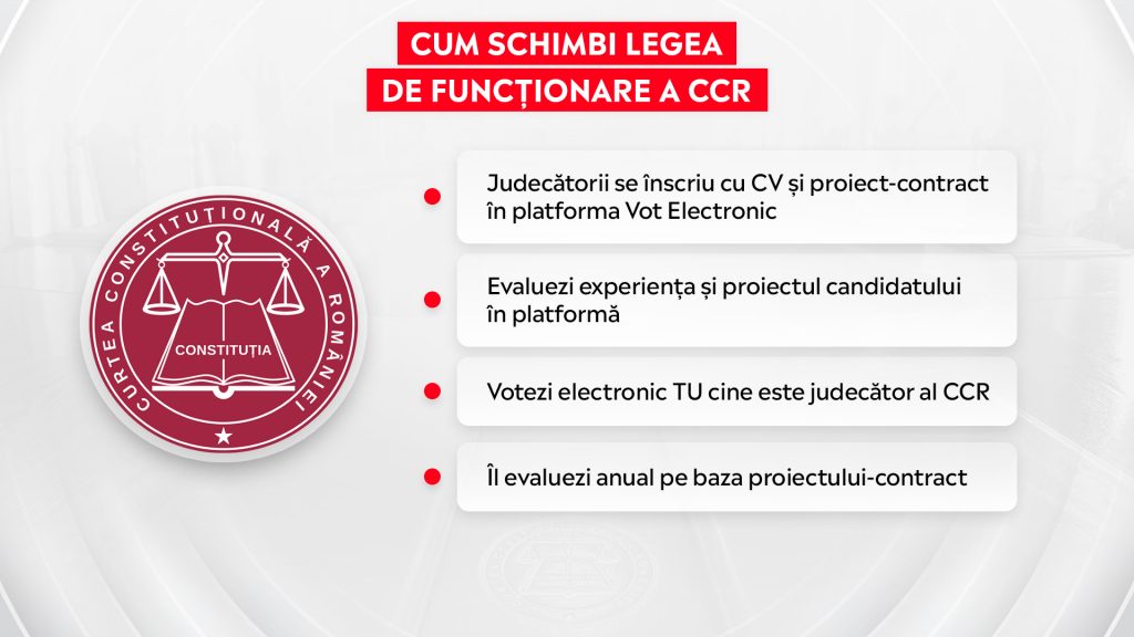 “Oamenii vor să urmeze decizii irefutabile. Uite, tu poți să schimbi legea de funcționare a CCR. Ne vine orice candidat cu un palmares clar. Adică am criteriile 1, 2, 3, 4. Programez un robot și le evaluează. Ca la testul grilă de la bacalureat. S-a calificat. Care-i proba următoare? Se prezintă în fața oamenilor. Intră pe orice social media și are o conferință de presă. Și după ce a fost validat respectivul candidat, vine în fața ta și vorbește cu tine.