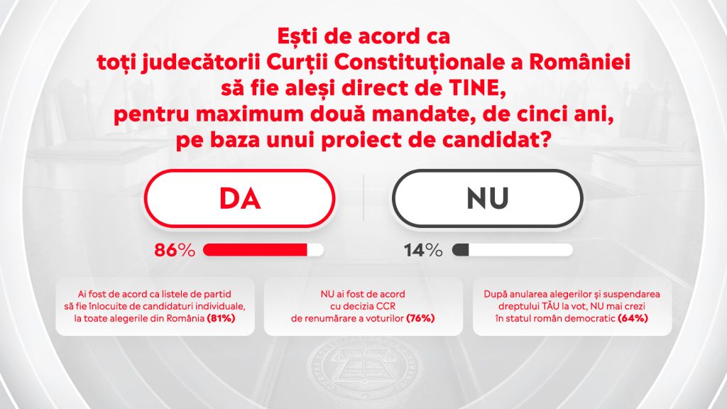Noi am folosit întrebarea din acest program, despre Curtea Constituțională ca un exemplu, foarte vizibil și încărcat de emoții, ca să vorbim, de fapt, de nevoia, de a vota direct pe toți cetățenii care iau decizii la nivel local și național”, afirmă Adrian Sârbu.