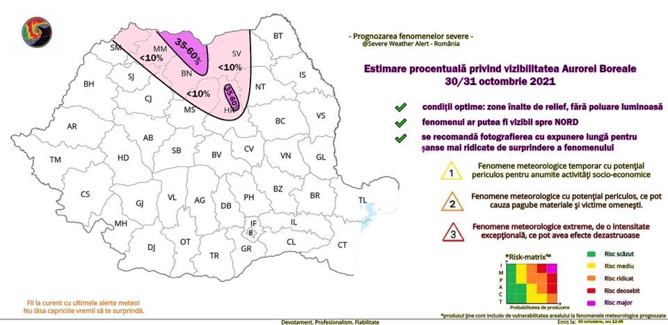 „Aurora Boreală ar putea fi PARȚIAL vizibilă din nordul României, în intervalul 30.10, ora 21:00 – 31.10, ora 03:00, în zonele zonele deluroase și montane din nordul țării (județele Maramureș, Bistrița, Harghita) – șanse 35-60%”, spun cei de la Severe Weather Alert – România.