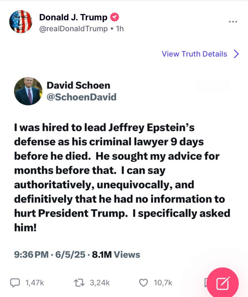 David Schoen, avocatul lui Jeffrey Epstein, îi ia apărarea lui Donald Trump, în urma acuzațiilor aduse de Elon Musk potrivit cărora „Președintele SUA apare în Dosarele Epstein, motiv pentru care nu au fost făcute publice”.