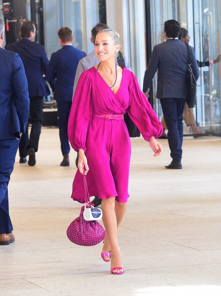 Când vine vorba de roz, mai mult este mai mult. Poartă această culoare din cap până în picioare à la Bradshaw sau temperează-o cu accesorii neutre.