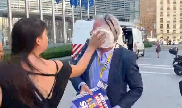 • Acesta a primit două plăcinte cu cremă în faţă, în timp ce se afla lângă un carton reprezentând-o pe Ursula von der Leyen.