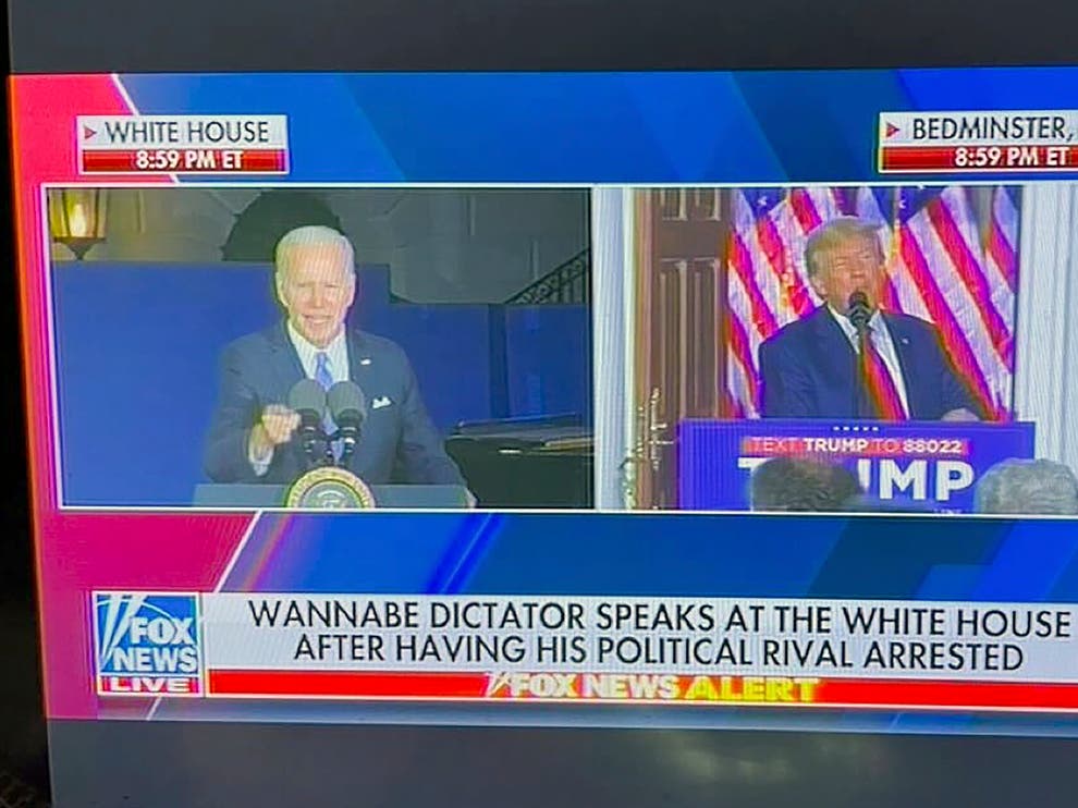 Emisiunea ,,Fox News Tonight” de marți a avut sub imaginile cu Biden și Donald Trump o grafică pe care scria: ,,Un dictator aspirant vorbește la Casa Albă după ce rivalul său politic a fost arestat” .