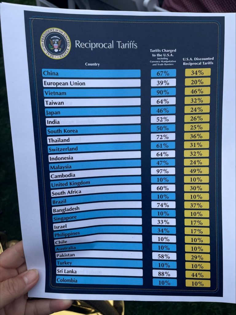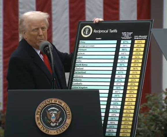 Trump a ridicat un grafic în timp ce vorbea, arătând că Statele Unite vor percepe o taxă de 34% pe importurile din China, o taxă de 20% pe importurile din Uniunea Europeană, 25% pe Coreea de Sud, 24% pe Japonia și 32% pe Taiwan.