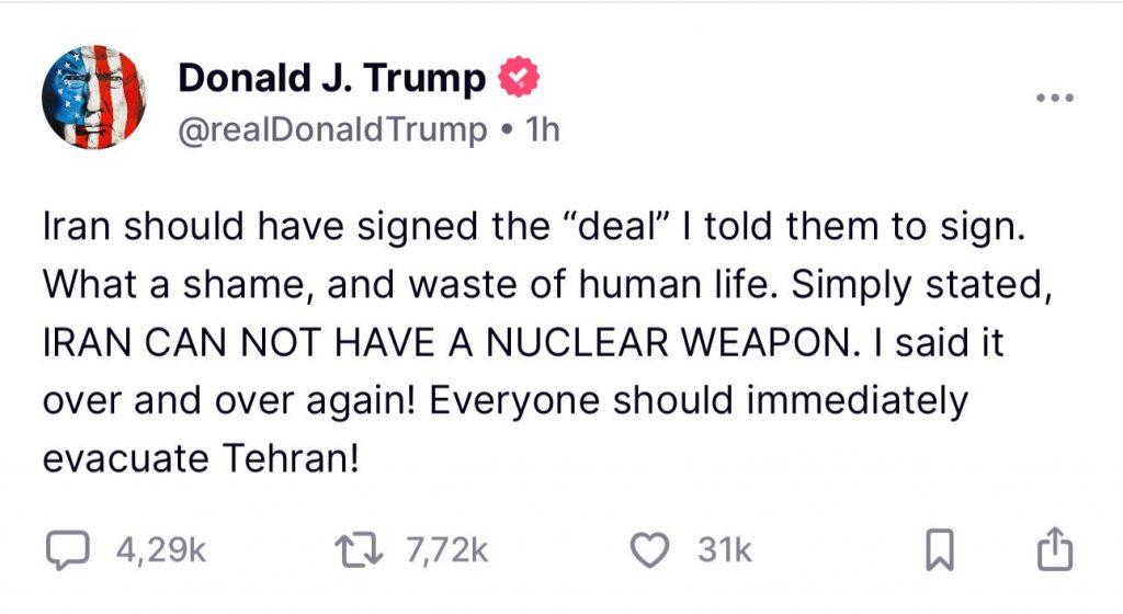 „Toată lumea trebuie să evacueze urgent Teheranul!”, a scris Președintele pe Social Truth, fără a spune de ce.