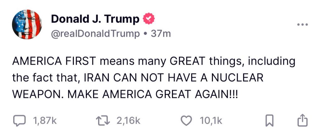 „Iranul ar fi trebuit să semneze acordul pe care i-am spus să-l semneze. Ce rușine și risipă de vieți omenești. Simplu spus, IRANUL NU POATE AVEA O ARMĂ NUCLEARĂ”, a scris el. „Am spus-o iar și iar!”.