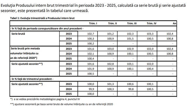 Seria ajustată sezonier a fost recalculată prin includerea estimării Produsului intern brut pentru trimestrul I 2025: